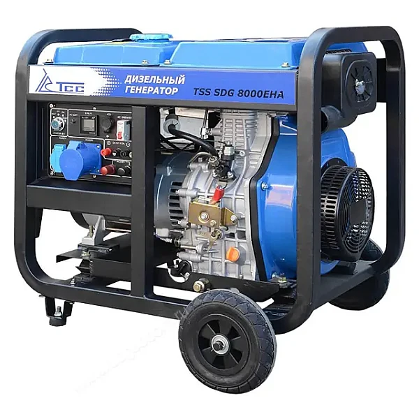 Дизель генератор с электростартом и с разъемом для подключения блока автоматики. TSS SDG 8000EHА предназначен для выработки электроэнергии с основными характеристиками: напряжение - 220 вольт, частота 50 Гц и номинальной мощностью 7,5 кВт, оснащенный колесным комплектом для удобства передвижения.
