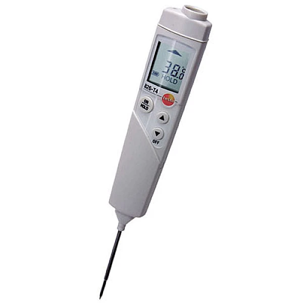 Пирометр Testo 826 T4 разработан специально для измерения температуры пищевых продуктов. Один компактный прибор сочетает в себе функции инфракрасного пирометра для поверхностных измерений и проникающего термометра для определения температуры внутри пищевых продуктов. Лазерный целеуказатель прибора помогает точно определить место измерения. По нескольким замеренным точкам Testo 826 рассчитывает среднее значение. Для упрощения замеров температуры внутри замороженных продуктов Testo 826 T4 укомплектован специальным сверлом.