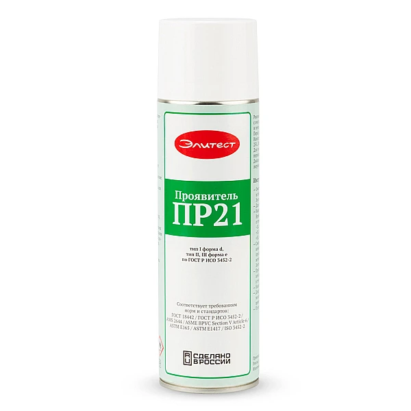 Элитест ПР21 — суспензионный проявитель на основе растворителей. Проявитель обладает высокими сорбционными свойствами, благодаря чему хорошо вытягивает находящийся в полости дефекта пенетрант. Легко наносится на поверхность, ложась ровным тонким слоем и создавая однородный белый фон. Проявитель Элитест ПР21 обеспечивает высокую чувствительность контроля за счет растворяющего воздействия на пенетрант в местах расположения дефектов.