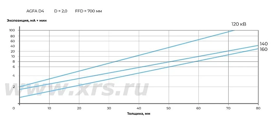Время экспозиции, величина анодного напряжения и анодного тока настраиваются вручную через пульт управления: диапазон установки напряжения составляет от 50 до 160 кВ, диапазон силы тока — от 0,5 до 5 мА. Это позволяет подбирать оптимальный режим просвечивания в каждом конкретном случае.